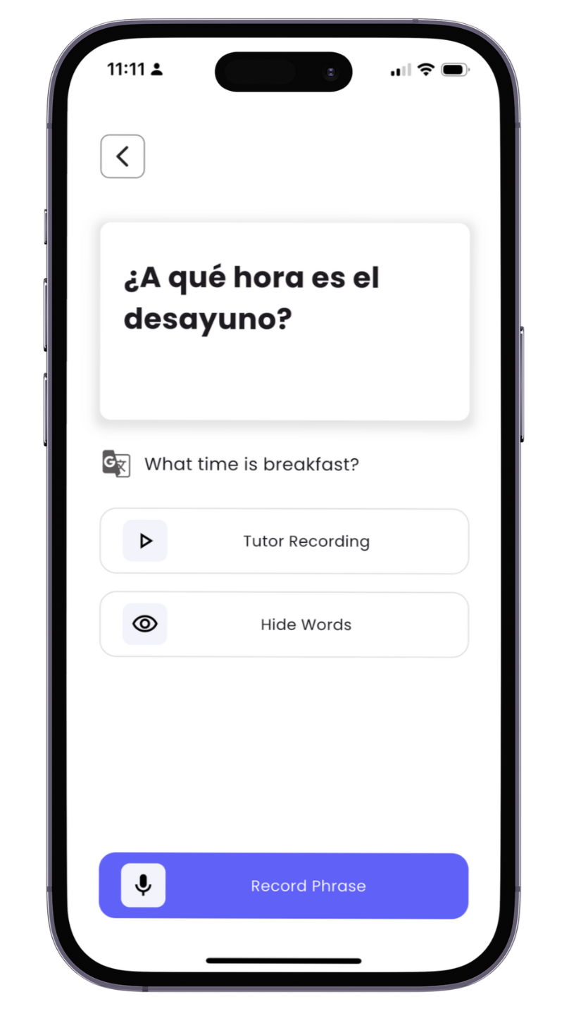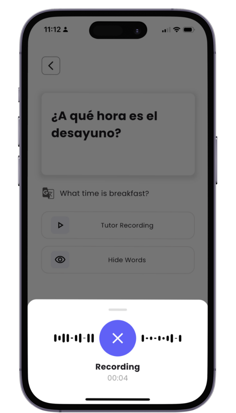 This is where you practice your phrase. Read it, listen to your tutor’s recording, then speak it aloud. Try to memorize it, then click 'Hide Words' to test yourself.When you're ready, click 'Record Phrase' to record and play it back.