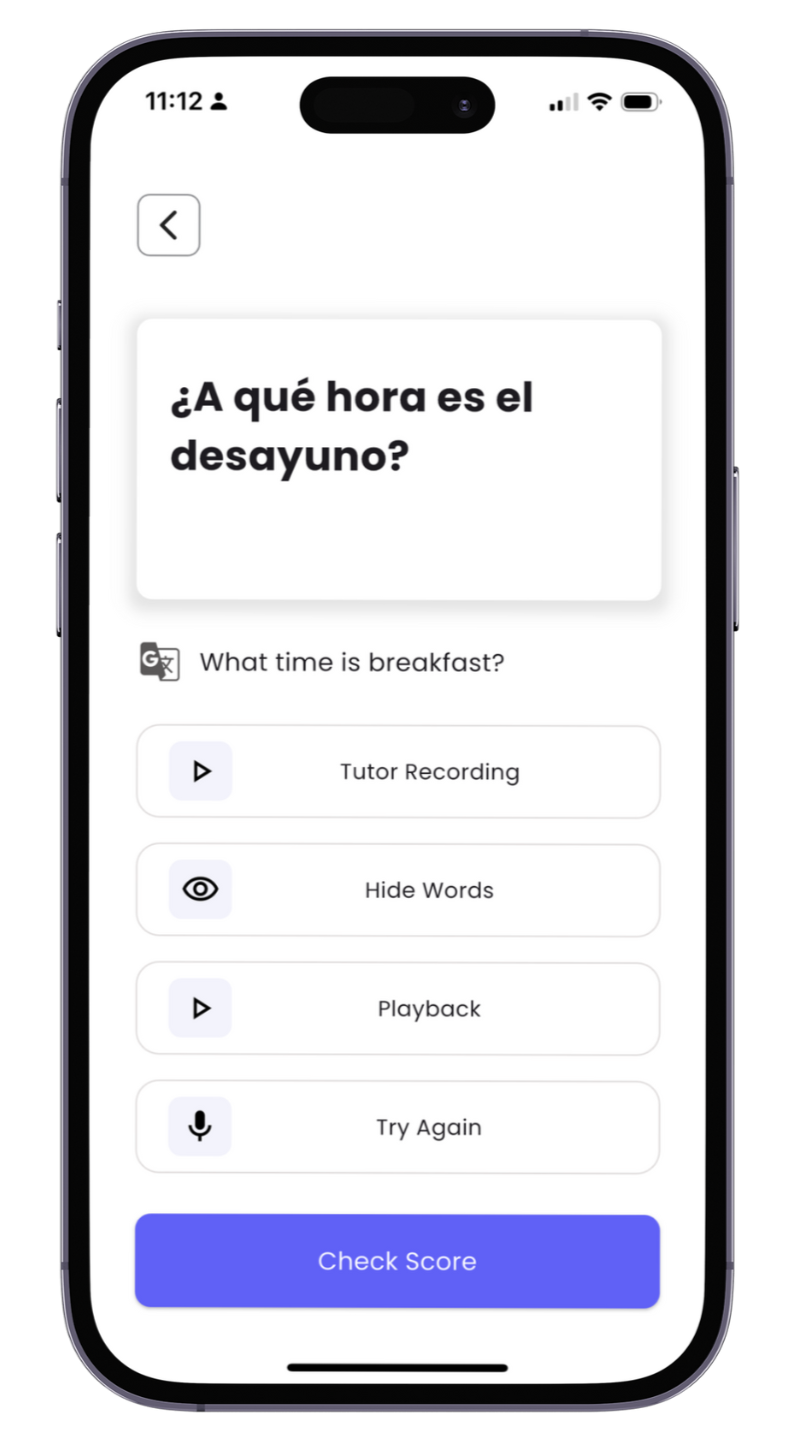 After recording, click 'Playback' to compare your version with your tutor's. If you'd like to improve, click 'Try Again' to re-record.Once you're satisfied, click 'Check Score,' and AI will analyze your recording.