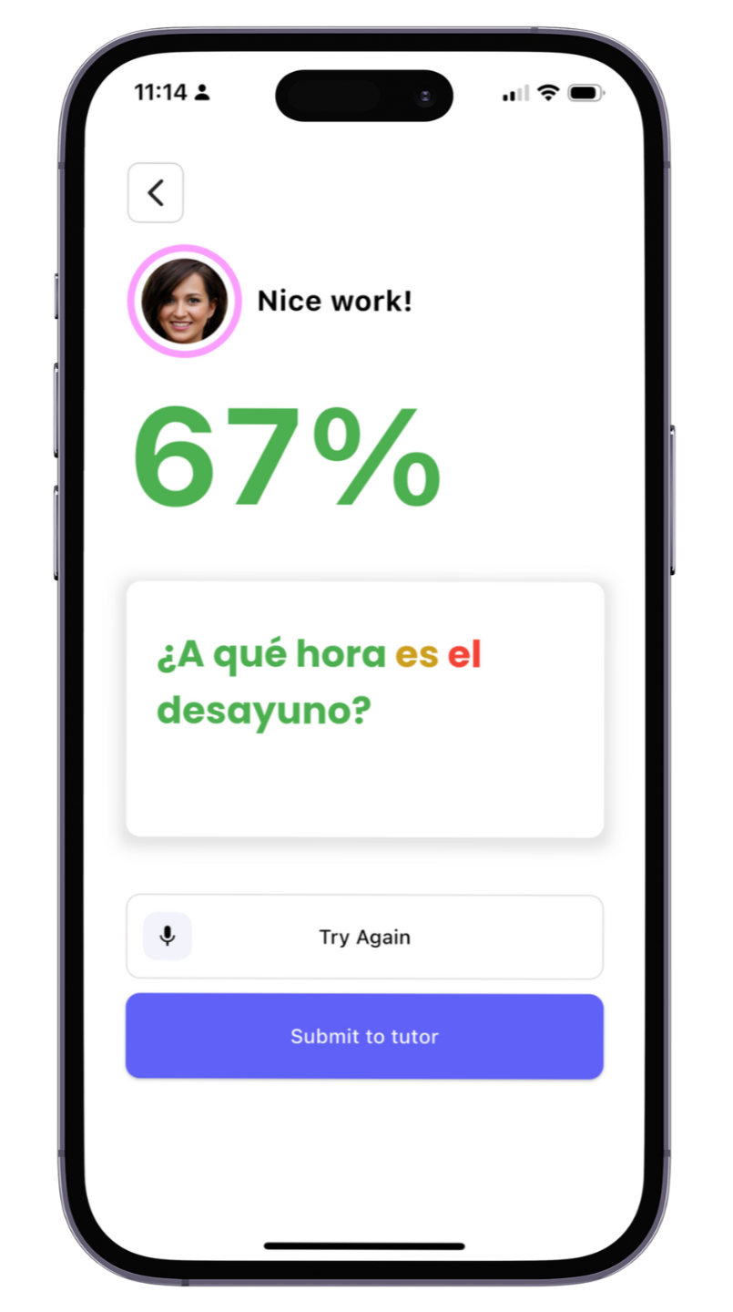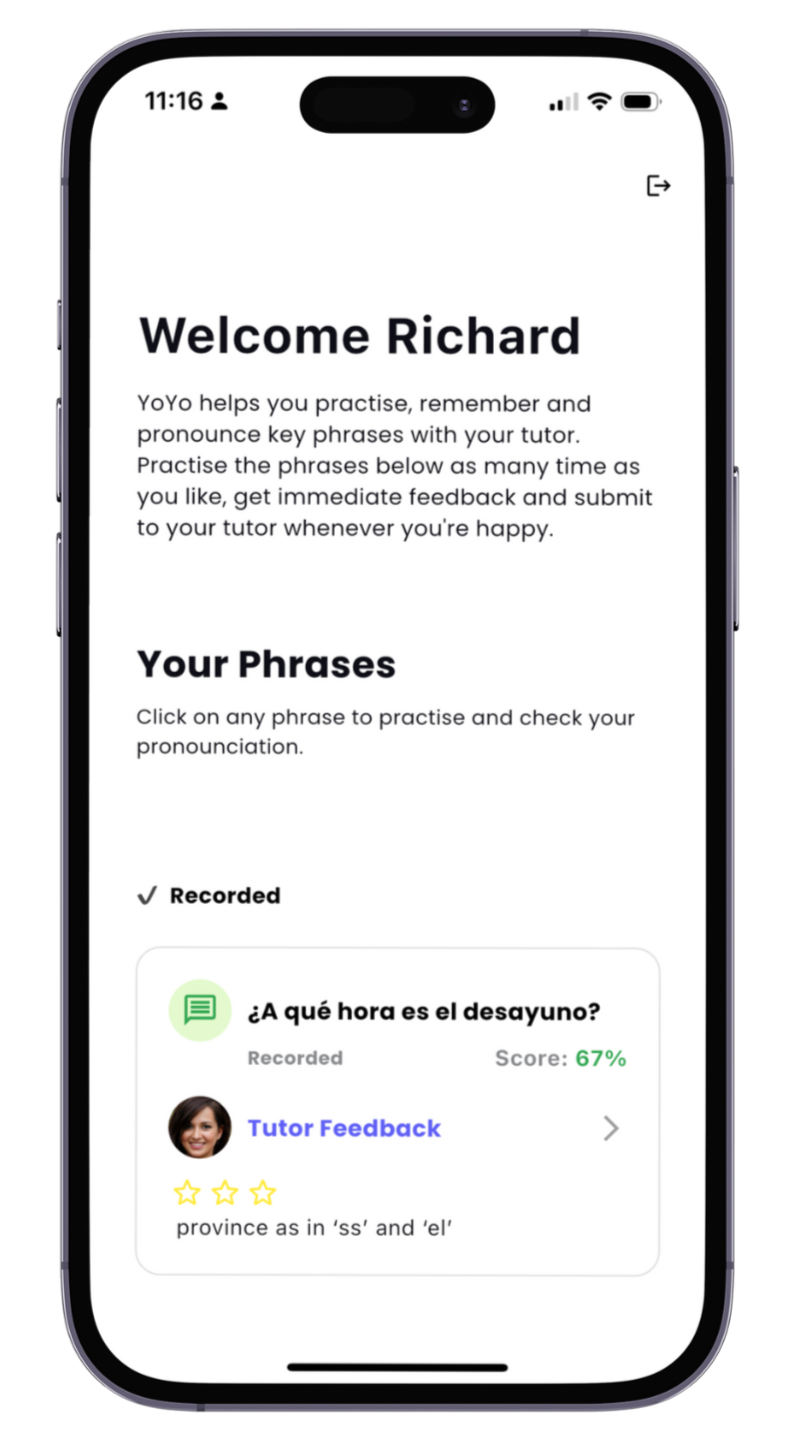Once you've submitted your recording, your tutor will assess it and provide feedback. If there's room for improvement, they’ll leave audio feedback to help you adjust how you say the phrase.They may also leave a comment and a score out of 5, giving you a clear visual assessment of your progress.